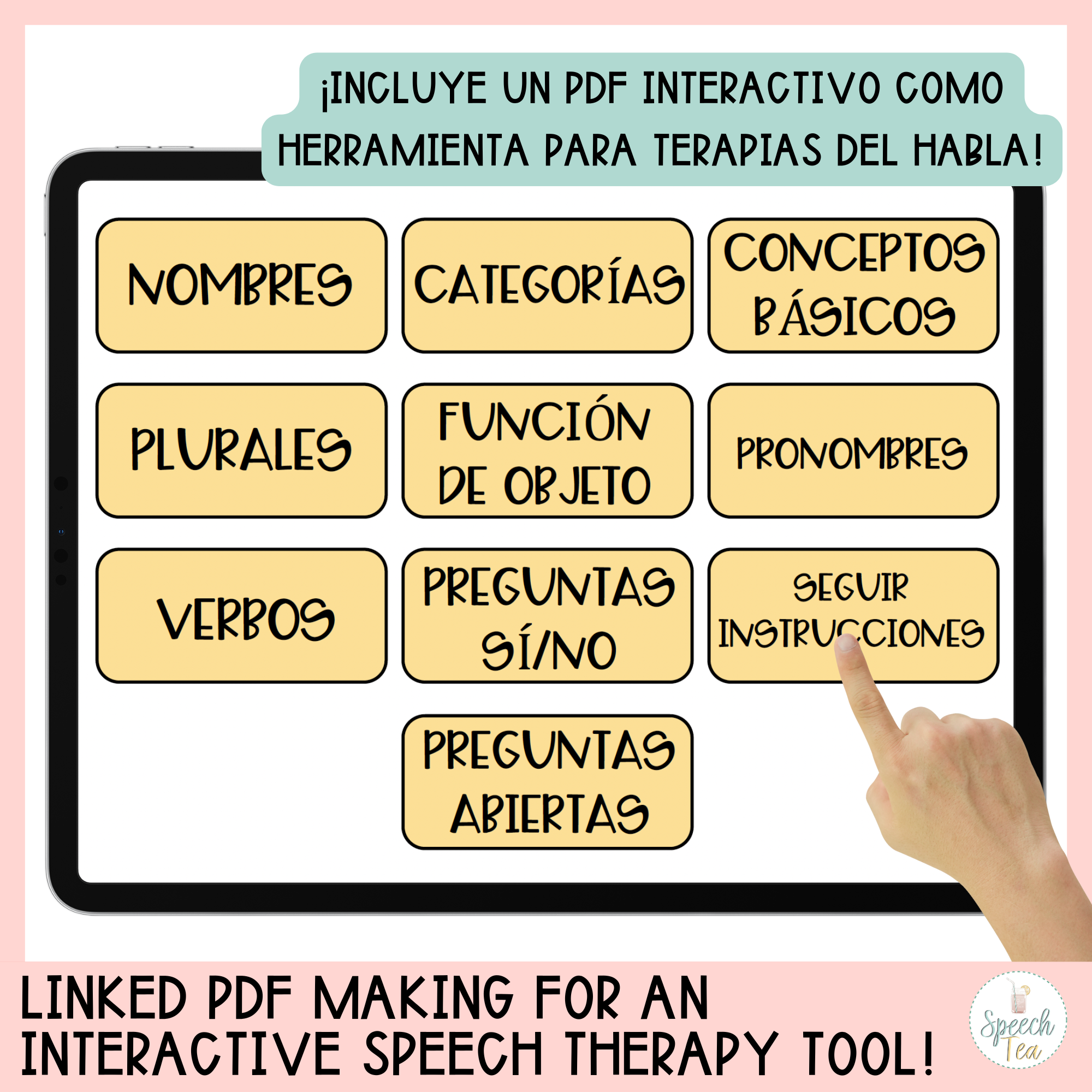 Esta versátil herramienta digital de evaluación y monitoreo del progreso del lenguaje preescolar se puede usar en teleterapia o en sesiones presenciales para monitorear el progreso, evaluar o intervenir con niños con dificultades lingüísticas. También incluye formularios de datos PDF editables. ¡Ahorre tiempo, energía e impresión! Este anuncio está completamente en español. Si desea la versión en inglés, haga clic aquí